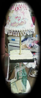 This was so fun to make! I had some leftover threaded lamp tubing I wanted to use, so I got a couple of boards about 6" square, drilled holes to accommodate the tubing and painted black. Then I decoupaged some scrapbook paper to each piece. I purchased a DIY lamp shade and adhered scrapbook paper with glue dots. I hot-glued some vintage pearl lace to the top and bottom of the shade. Then I began the assembly. I had an old suet cage I just slipped the tube through, and it moves freely. I cut out some scrapbook paper that looked like old postcards into similar-sized pieces and ran string through and tied on the suet cage. Put a couple of nuts on each side of the wood pieces to hold them in place and it was done!